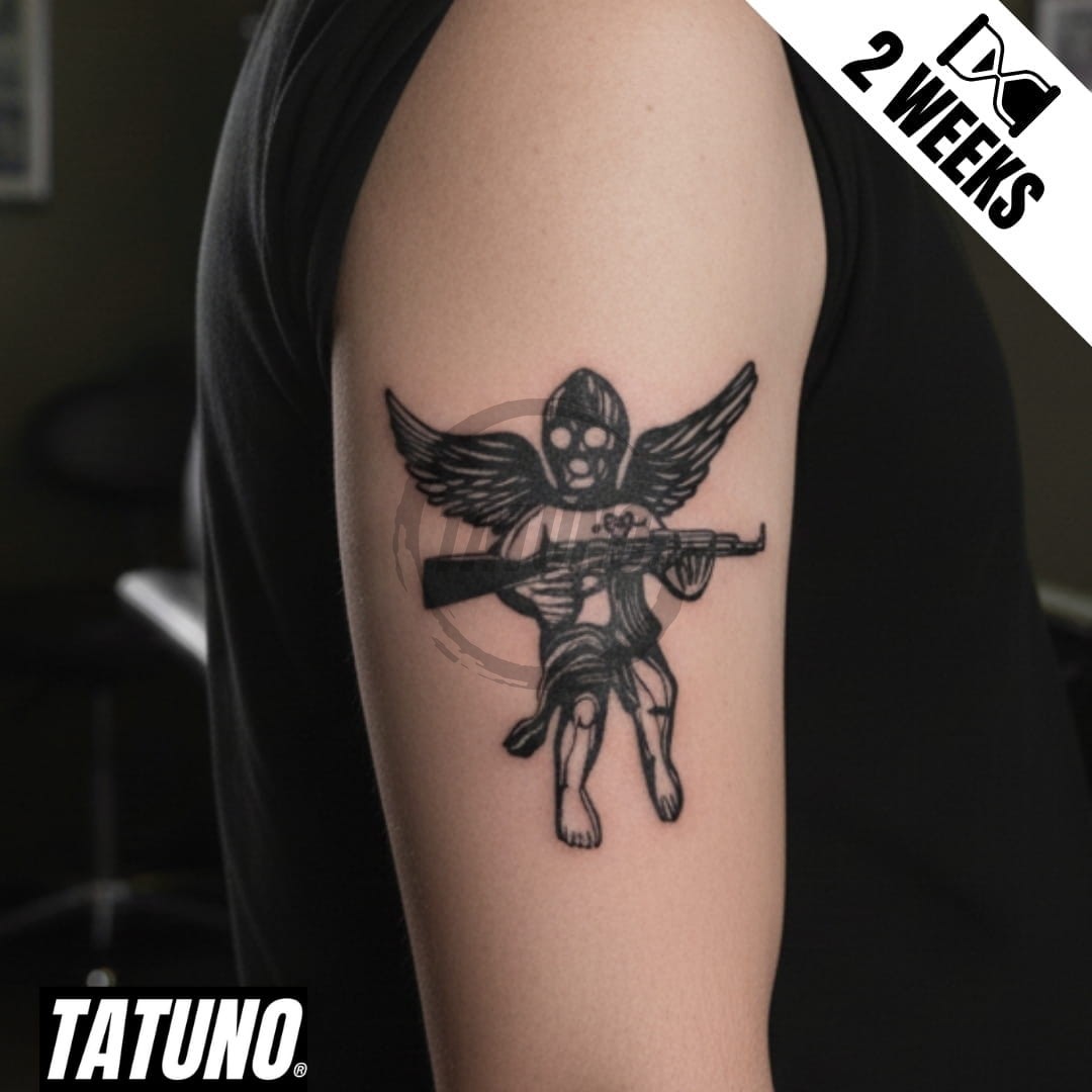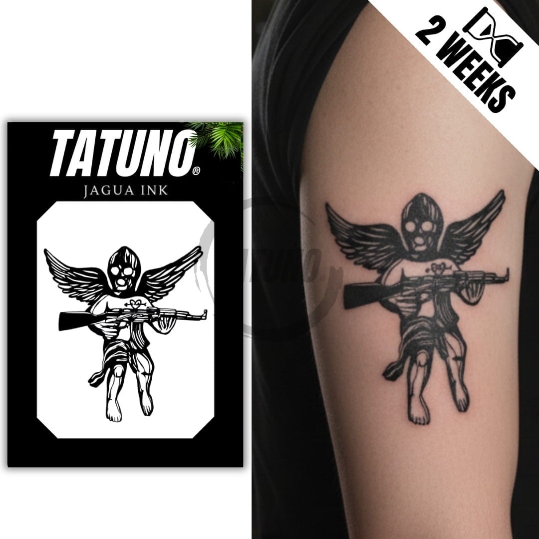 Semipermanentes Jagua-Tattoo Heiliger mit Gewehr [10,5 cm x 7,5 cm]